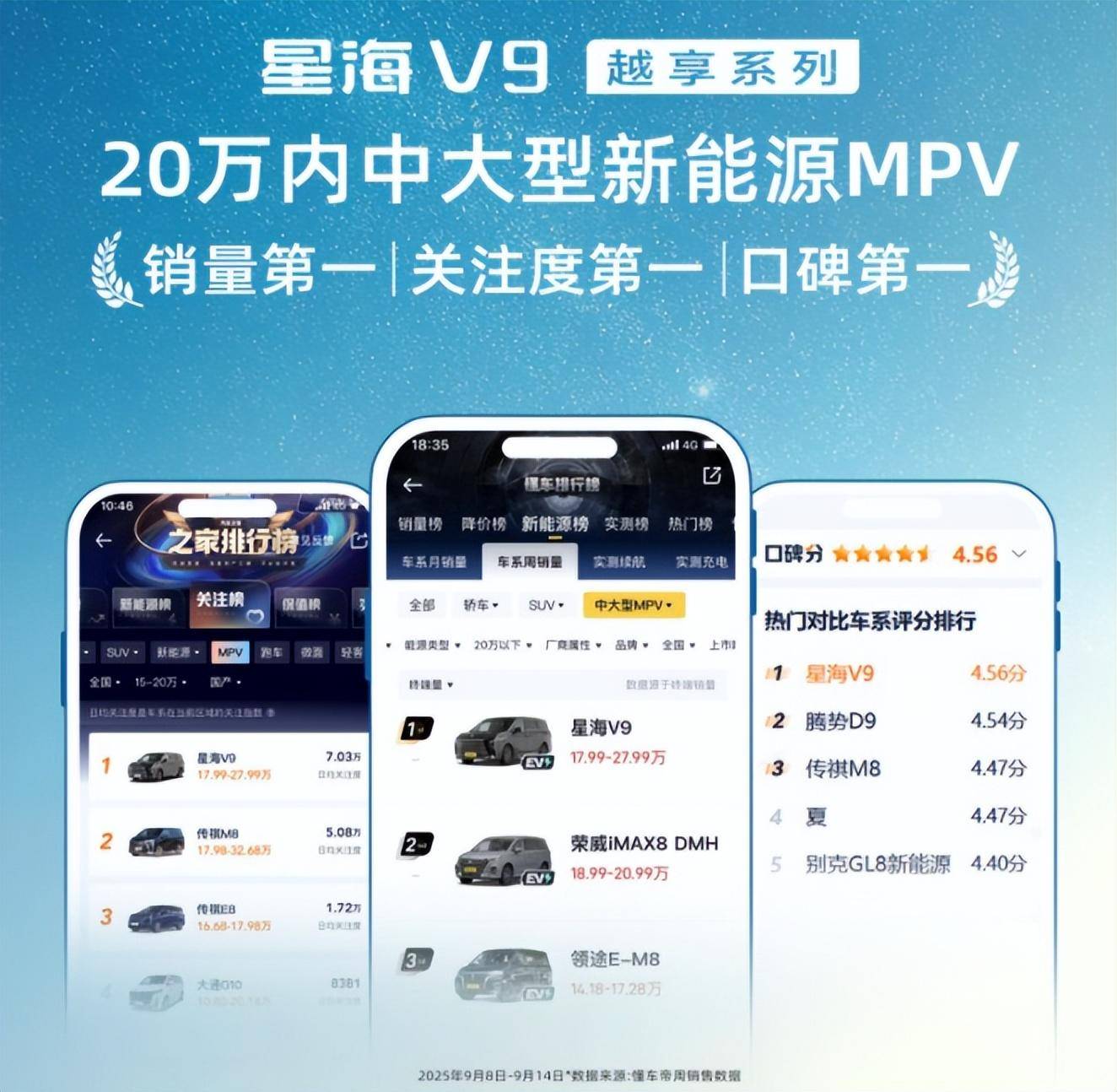 第一,15-20万国产MPV汽车之家关注度第一;第二,20万内中大型新能源MPV销量第一;第三,汽车之家、易车、懂车帝三大权威平台MPV口碑榜榜首。毫无疑问,以上这些来自真实用户参与投票,并由目前国内最权威的三大汽车平台公布的榜单,不仅都是含金量十足的权威榜单,同时还意味着星海V9越享系列夺得了行业罕见的大满贯!