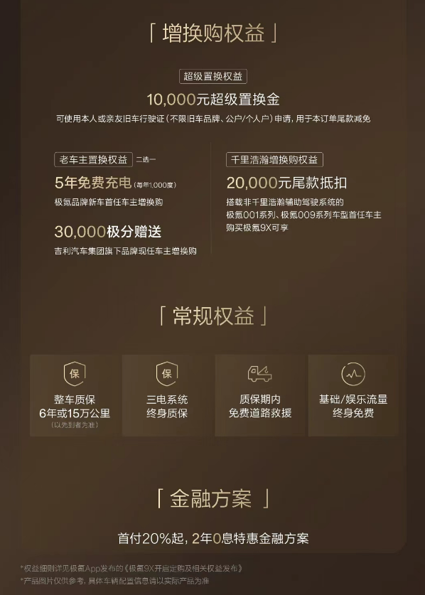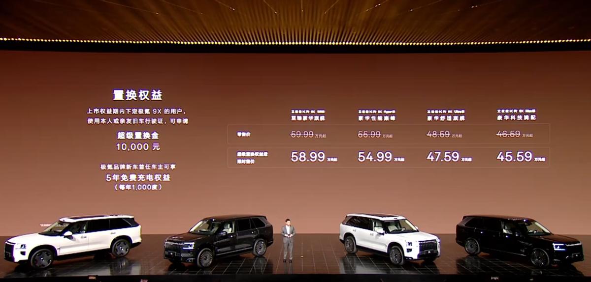 9月29日,极氪9X正式上市,售价:46.59万元-59.99万元,超级置换权益后限时售价:45.59万元-58.99万元。