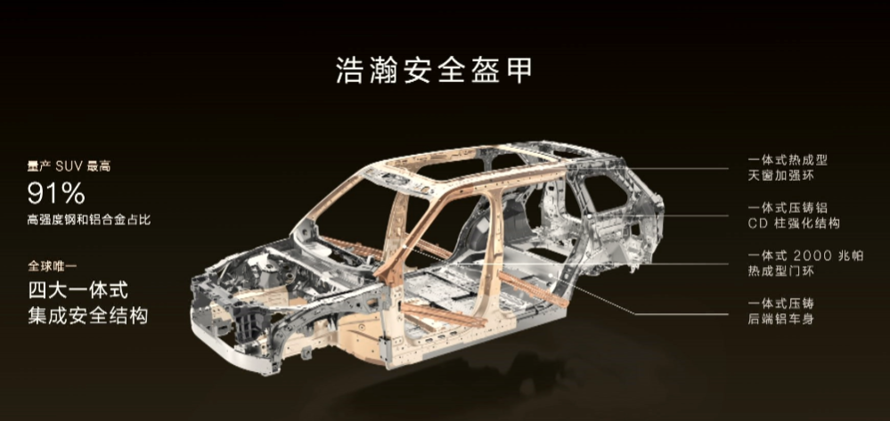 车身高强钢和铝合金占比达到91%,全车10处2000Mpa超高强度热成型钢,同级最高41600Nm/deg车身扭转刚度,进一步提升操控和安全。