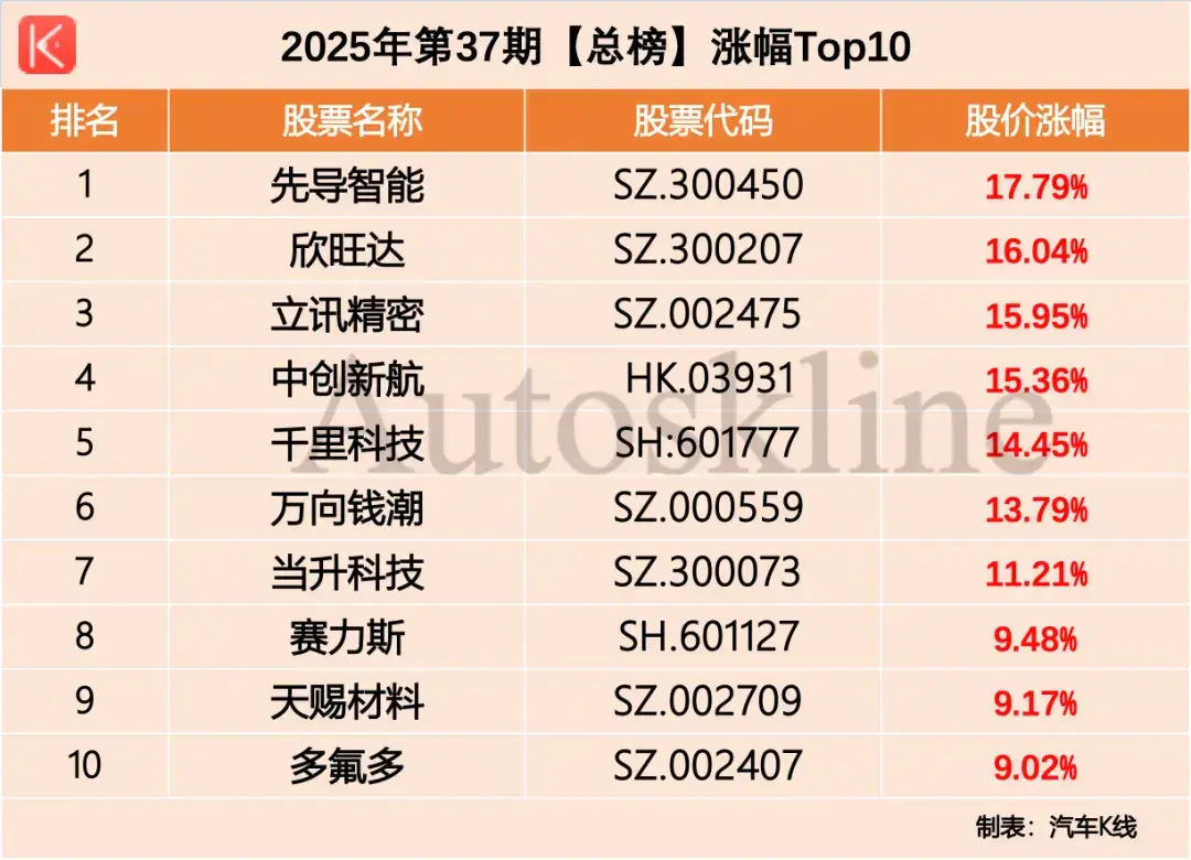 从总榜来看,涨幅最高者为先导智能,上涨17.79%;股价周内刷新52周最高69.72元,截至上周五收盘报65.49元/股。