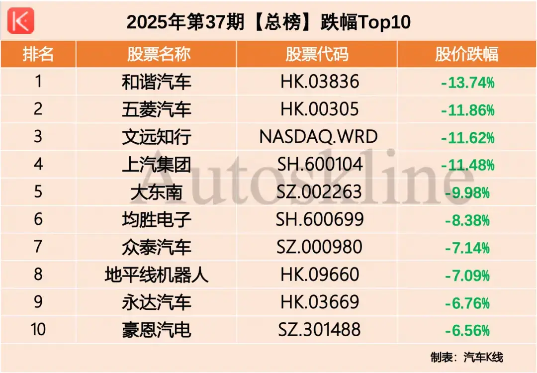 跌幅方面,经销商和谐汽车下跌13.74%垫底,同时五菱汽车、文远知行和上汽集团的跌幅也都超过10%。