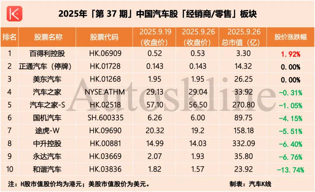 受大盘影响,港股聚集的经销商板块成为“重灾区”,周度下跌幅度高达3.6%,仅百得利控股微涨1.92%,其余除美东汽车持平外全部走低。