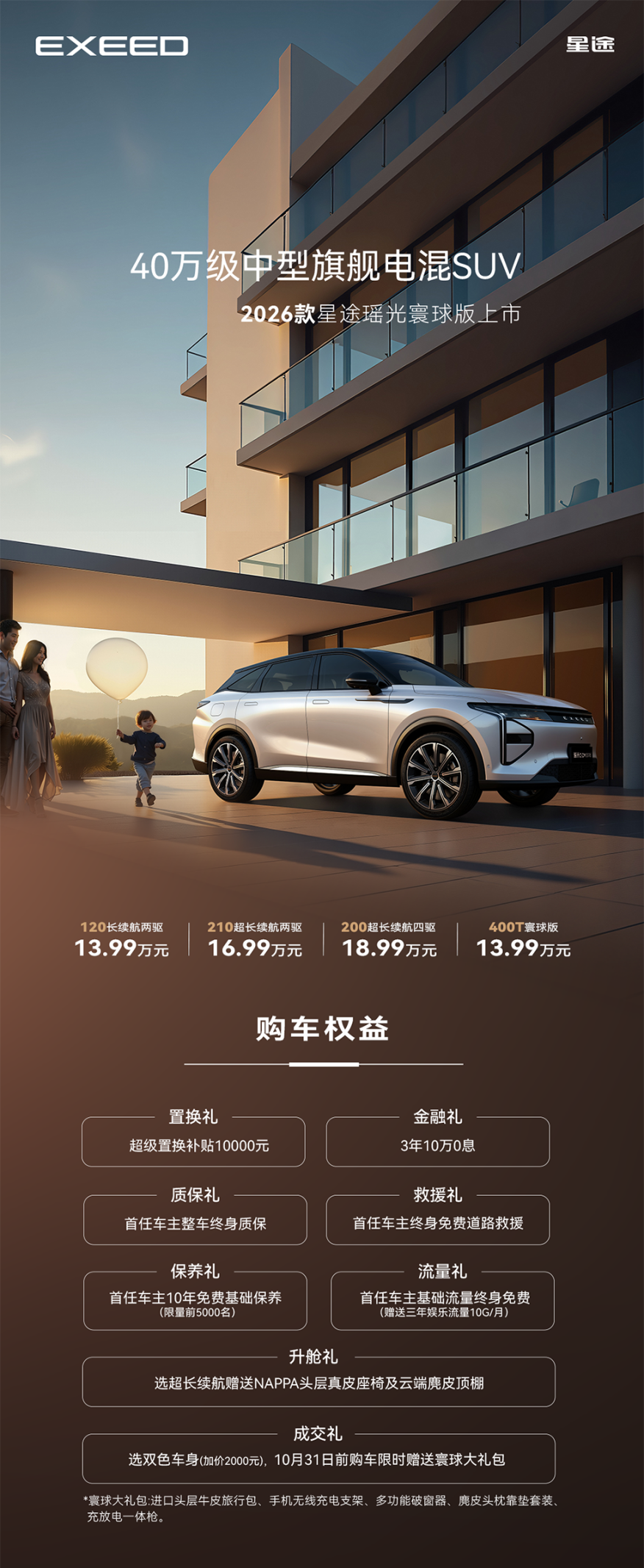 星途营销中心执行副总经理张梦元在发布会上表示:“瑶光C-DM寰球版从品质、到安全、到性能,都是40万级全球豪华标杆!”从实测2.85L油耗的技术突破,到双五星安全的品质保障,再到“高价海外、平价国内”的定价策略,瑶光C-DM寰球版不仅重构了40万级电混SUV的价值标准,更展现了中国高端汽车品牌在新能源赛道的自信。对于追求“既要、又要、还要”的城市新生代家庭来说,这款“油耗低、性能强、安全高、配置全”的中型旗舰电混SUV,或许正是打破选择困难症的最优解。