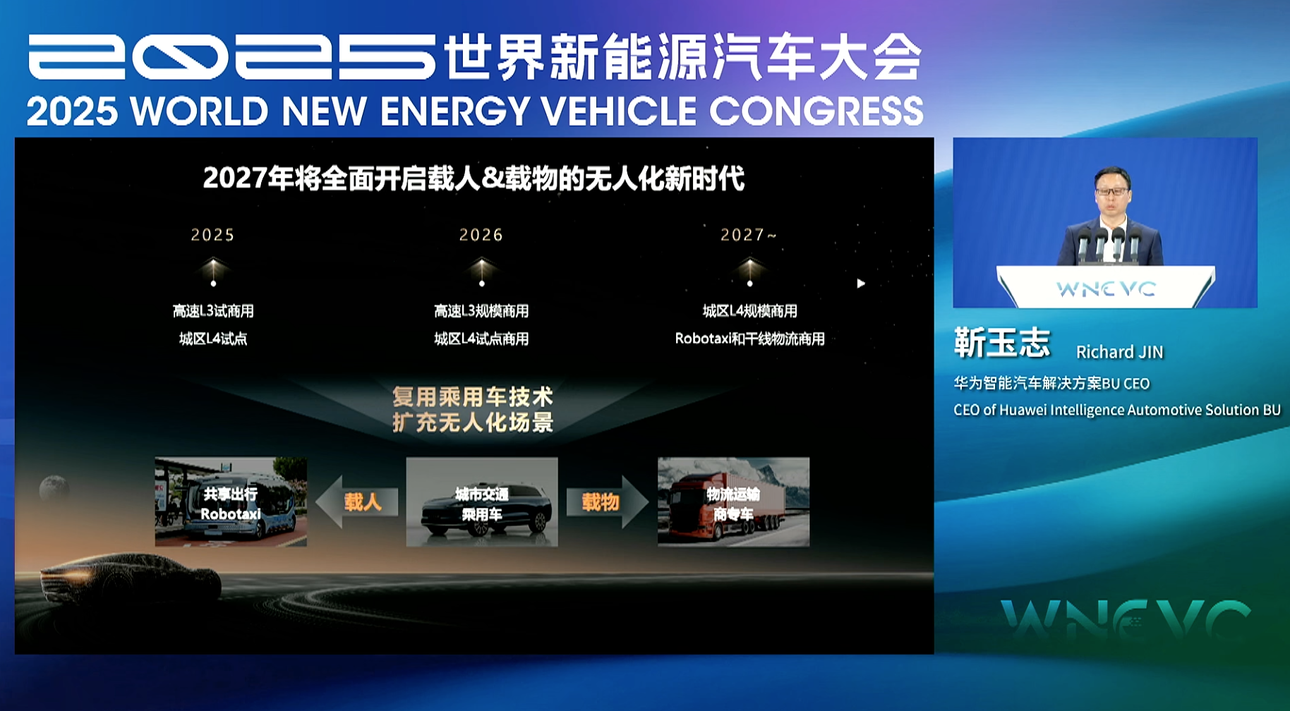 在技术发展路径上,靳玉志介绍了华为乾崑的阶段性规划。2025年,ADS 4系统首发面向L3技术架构的高速商用解决方案,具备高速L3试点商用能力及城区L4测试能力;2026年,在法规允许前提下,力争实现高速L3规模商用及城区L4商用试点;2027年,随着高速与城区NCA功能普及,L3将实现规模放量,城区L4进入商用阶段,Robotaxi与干线物流逐步落地,全面开启载人&载物的无人化新时代。