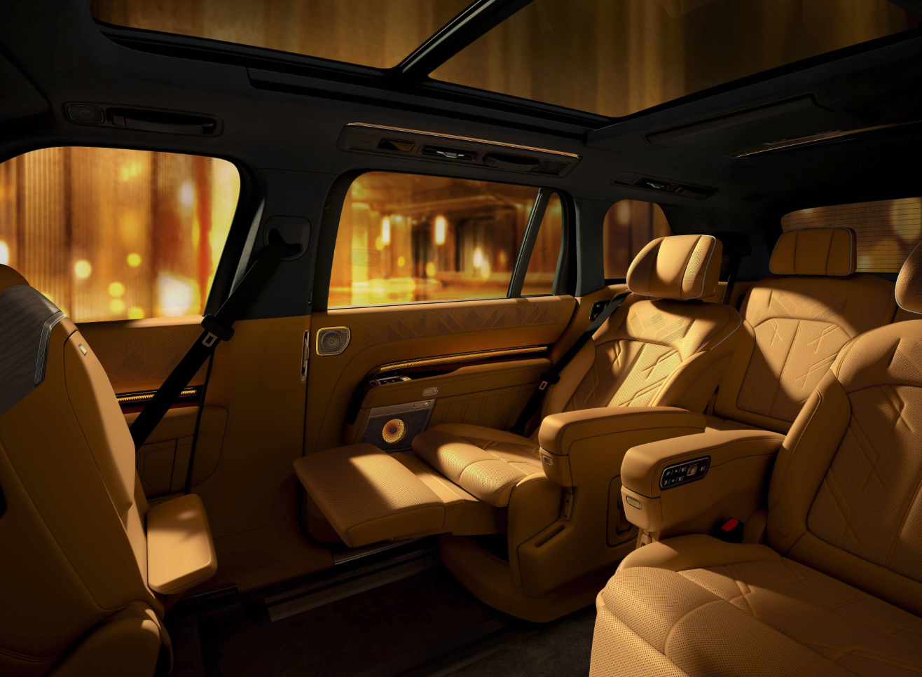 官方在车内用料上也有些说法:整车提供了 14 处北欧天然真木饰板,全车三排座椅的靠背、座垫、中央扶手、门板局部等位置都用上了 Soft NAPPA 全粒面头层真皮,顶棚更是用麂皮绒包覆,细节位置还配备 1680 万色流光溢彩氛围灯,支持 256 色光谱深度调校。