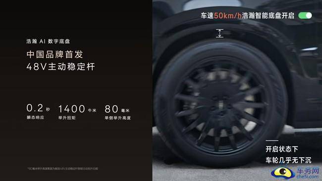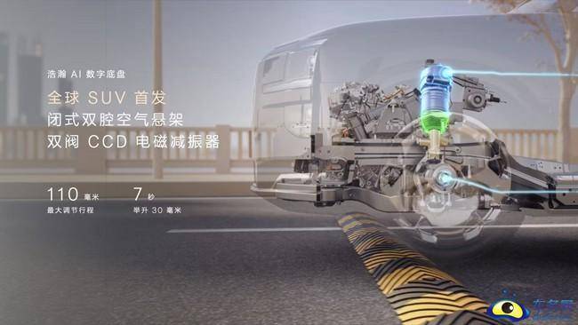 底盘技术上,首发浩瀚AI数字底盘,全系标配闭式双腔空气悬架、双阀CCD电磁减振器与48伏主动稳定杆,0.2秒内完成80毫米举升,实现“零侧倾”动态表现,支持7种地形自动识别。