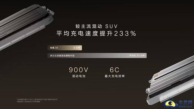 作为全球首个900V混动高压平台车型,极氪9X搭载自研浩瀚超级电混SEP,配备全球首套三电机兆瓦级混动电驱系统,综合输出超1400匹马力,零百加速全系3秒级(最快3.1秒),最高时速240公里。续航与补能实现“四重快”:搭载宁德时代900V混动专用电池,70度版本纯电续航380公里(同级最高),55度版本300公里;两种电池均支持6C超快充,20%-80%仅需9分钟;145千瓦增程发电机可在120公里/小时馈电工况下90分钟充至80%,实现“边开边充”。即便电量低于20%,加速性能与满电差距仅0.2秒,彻底打破混动车型“馈电失速”痛点。