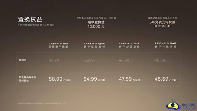 2025年9月29日,极氪旗下全球超豪华SUV新旗舰——极氪9X在上海正式上市。新车共推出Max版、Ultra版、Hyper版、曜黑版四个版型,官方零售价46.59万元起,超级置换权益后限时售价45.59万元起(限时周期至2025年12月31日)。作为基于浩瀚-S豪华电混专属架构打造的战略级作品,极氪9X首发浩瀚超级电混、浩瀚AI数字底盘、浩瀚安全盔甲与千里浩瀚辅助驾驶四大核心科技,以3秒级加速、380公里纯电续航、900V超快充等颠覆性产品力,重塑新能源旗舰SUV价值标杆。即日起,用户可通过极氪全渠道开启预定,预售数据显示80%用户来自高端豪华品牌增换购,海外市场已出现5-10万元加价求购热潮。