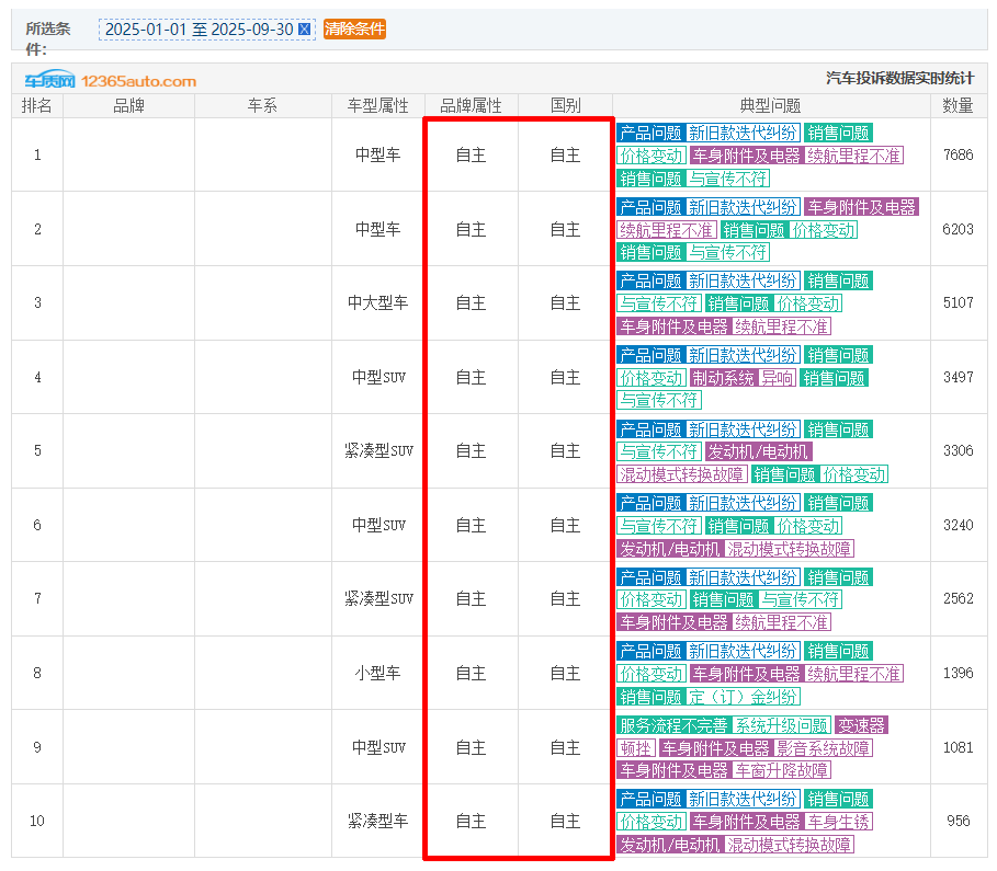 2025年前三季度的汽车典型问题投诉量排名和典型问题已确认,感兴趣的读者可以自行参考全国汽车消费者投诉受理处置服务平台(车质网)的公开资料。由于数据略显夸张,投诉量最大的前十名仅来自两家车企,其中某新能源汽车制造商独占9个席位,另一款车还是燃油车(第九名);所以在这里就不发布其排名数据了,重点来看一看前三季度里的车主们最头疼的典型问题。