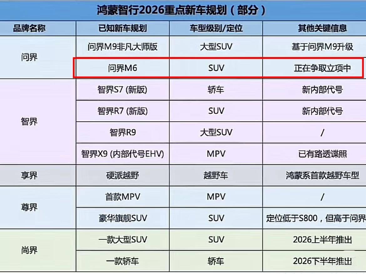 兄弟们,你们是不是觉得前阵子上市的问界M7价格太贵,感觉鸿蒙智行在定价这块上有点飘了?如果你此刻正有这样的想法,那我只能说,你们可能真的是错怪华为了,为啥这么说呢?因为要不了多久,鸿蒙智行就有可能又会推出比问界M7定位更低的车型,没错,说的正是一直在问界数字命名体系里所欠缺的问界M6。