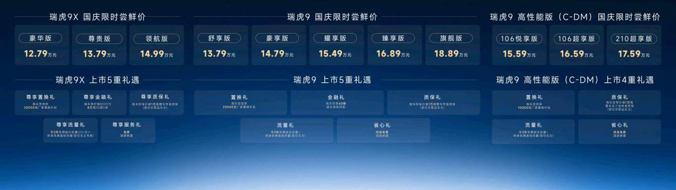 此次上市的瑞虎9系列形成完整价格矩阵:瑞虎9X限时抢先价12.79万元起主攻入门市场,瑞虎9以13.79万元起聚焦主流家庭用户,瑞虎9 C-DM则以17.59万元起满足混动需求。同步推出的低首付购车等多重礼遇,更让用户以主流预算享受到20万级配置与30万级体验。