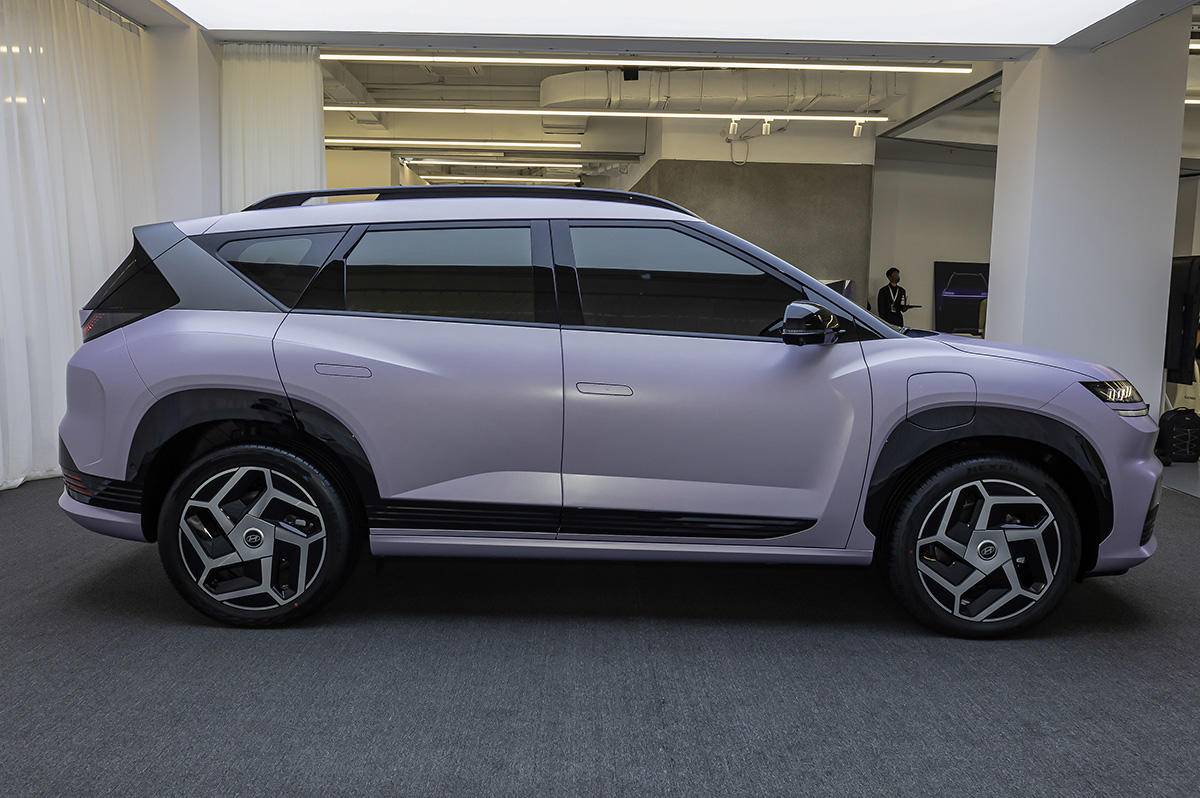 车身侧面部分的造型也有着很高的辨识度,A柱为黑色的涂装,后扬的D柱则是使用了银灰色涂装,在D柱后侧还有一块黑色的饰板设计。前后折痕式双腰线有着不错的运动感,车身下边裙上的黑色饰板和黑色的后轮眉相呼应,车门把手为隐藏式设计。