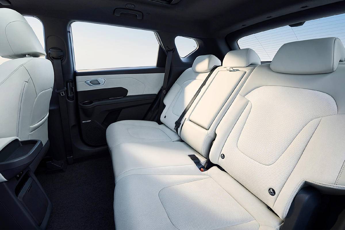 内饰部分,中控台为错层式设计布局,主驾驶侧提供远端小型仪表盘和抬头显示系统,上部的空调出风口带有贯穿式镀铬饰条,下层的中控面板上使用了27英寸的中控屏和副驾连体屏。方向盘使用了双色皮质包裹,有着不错的精致感。副仪表台区域提供双手机无线充电板和四个杯架,底部还带有储物空间。