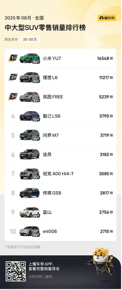 数据显示,上市后的第一个完整自然月,岚图FREE+便强势迎来开门红,8月以5239台的销量数据成功杀入细分市场头部阵营,与小米YU7、理想L6一起成为20万-30万元级中大型SUV市场Top3。站在用户角度而言,20万-30万元级SUV市场的选择很多,理想L6与小米YU7都是经过了市场检验的成熟产品,为什么岚图FREE+能够在细分市场迅速出圈,超高智价比和配置、底盘、智能化等方面优势起到了决定性作用。