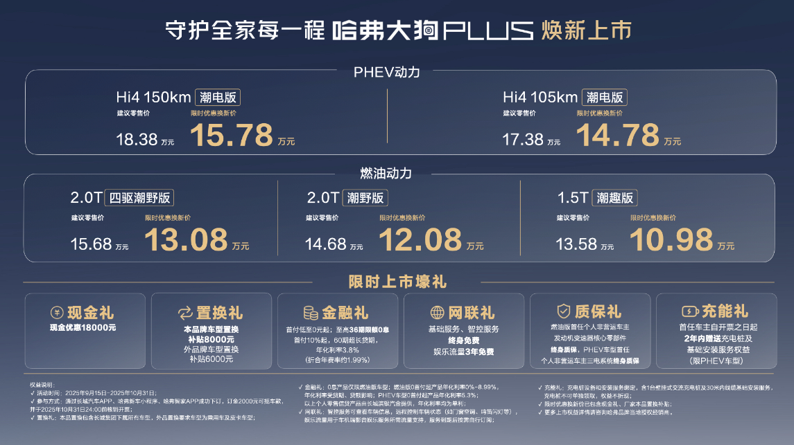 从品质到性能,从动力到空间,哈弗大狗PLUS以“真诚、可靠、懂你、守护你”的实力,上市即热销,即日起至 10 月 31 日,限时换新优惠价 10.98 万元起,还推出 6 重限时壕礼。下定可享18000元现金礼,至高8000元真金白银置换补贴。更有0首付,至高36期限额0息金融礼遇,助力年轻家庭轻松开启美好生活。