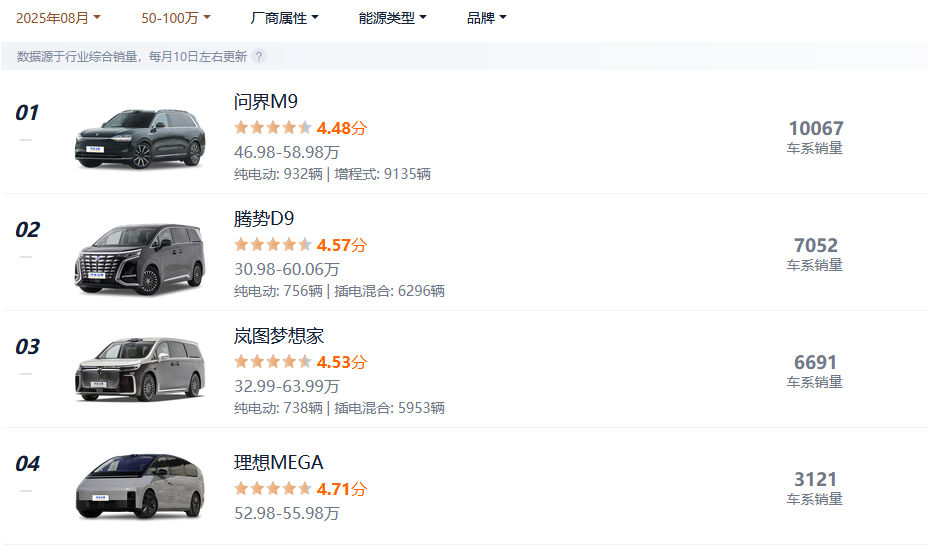 于外,问界M9几乎垄断了50万大六座SUV的市场,在M9之下,全是MPV的身影,大家也需要第二个选择;