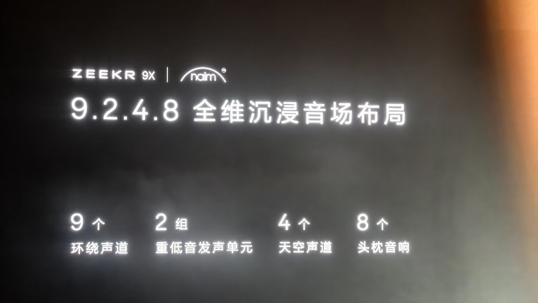 音响方面,极氪9X搭载了英国的Naim音响系统,采用了9.2.4.8音场布局(9个环绕声道,2个中置声道,4个天空声道,8个头枕音响),包括32个扬声器,总功率达到目前行业最高的3868W。