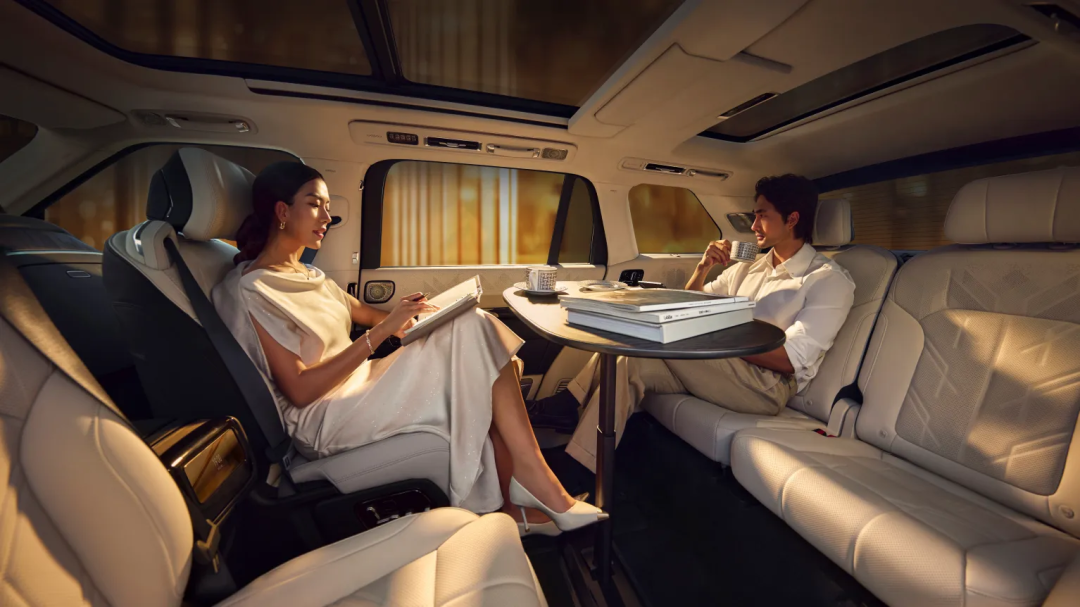 极氪9X的座椅也可以向后旋转,进而与三排行程面对面的格局,家庭聚会或者商务会客都非常适合。