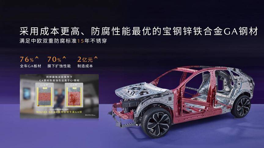 品质上也没话说,EZ-60 产自长安马自达南京工厂,按全球统一标准造。研发时投入超 900 辆测试车,跑了 900 多万公里,-40℃极寒、80℃高温、5000 米高海拔都试过,可靠性拉满。车身用宝钢 GA 锌铁合金板材,盐雾测试 960 小时不生锈,相当于自然环境下抗腐蚀 30 年,开十年还像新的一样。