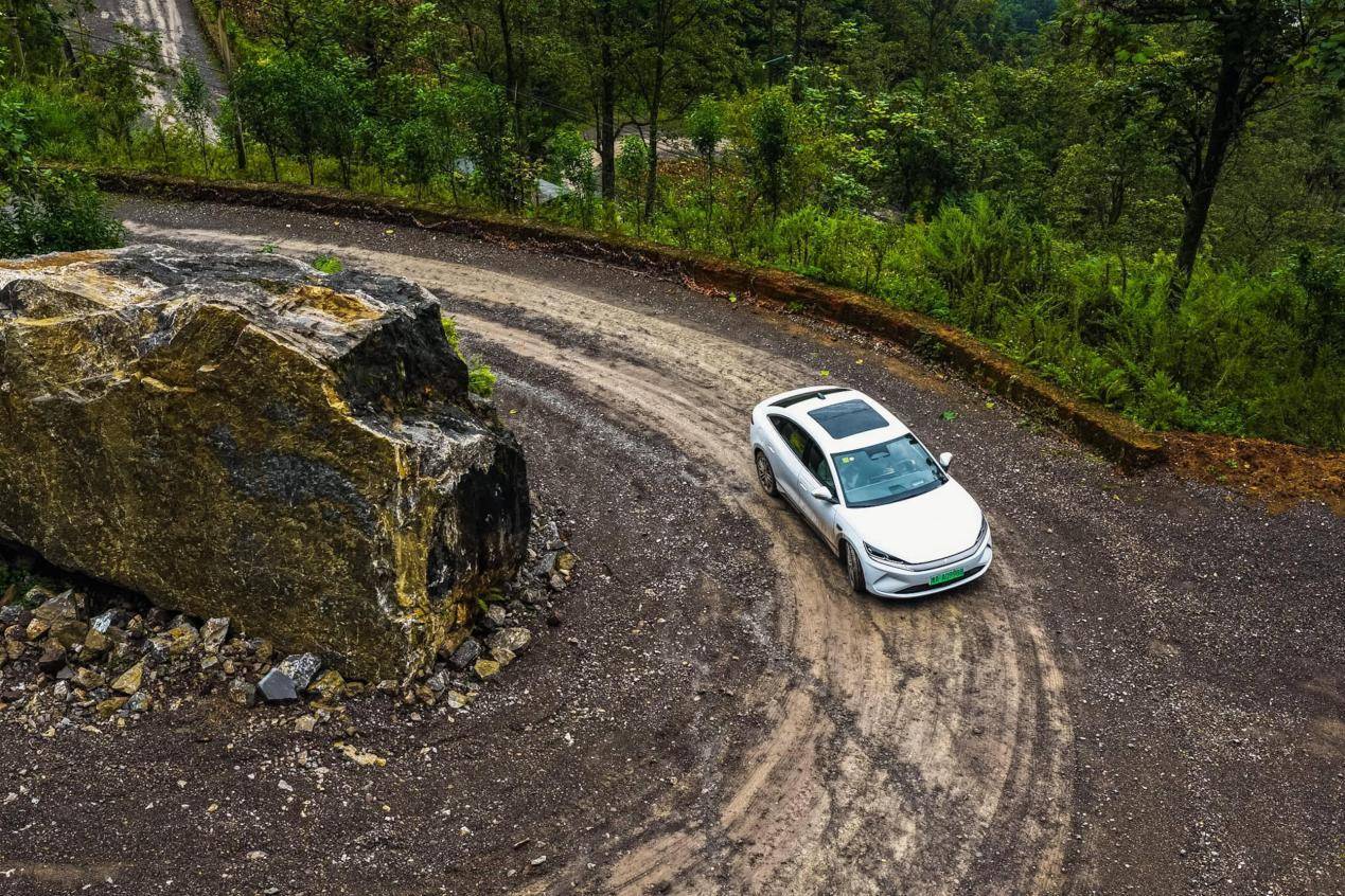 行至晴隆 24 道拐,这条长 4 公里、路面未做硬化的 “史迪威公路”,以连续急弯与陡坡构成天然试车场。切入运动模式后,云辇 - C 迅速切换至低频大阻尼状态,配合后置后驱布局与 50:50 黄金配重比,车辆过弯侧倾被大幅抑制。在第 17 道拐的回头弯中,深踩电门加速出弯时,车身姿态始终稳健,这得益于CTB电池车身一体化技术带来的40500N・m/° 扭转刚度,比传统轿车刚性提升近50%。