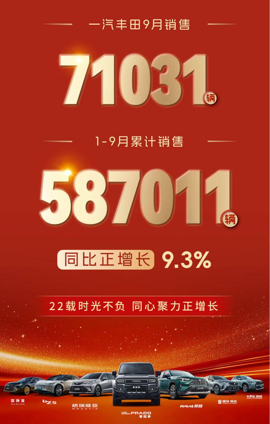 【行业资讯】2025年10月1日,一汽丰田率先公布9月销售业绩;9月销售新车71031辆; 1-9月累计销售新车587011辆,同比增长9.3%,正增长定式持续延续。