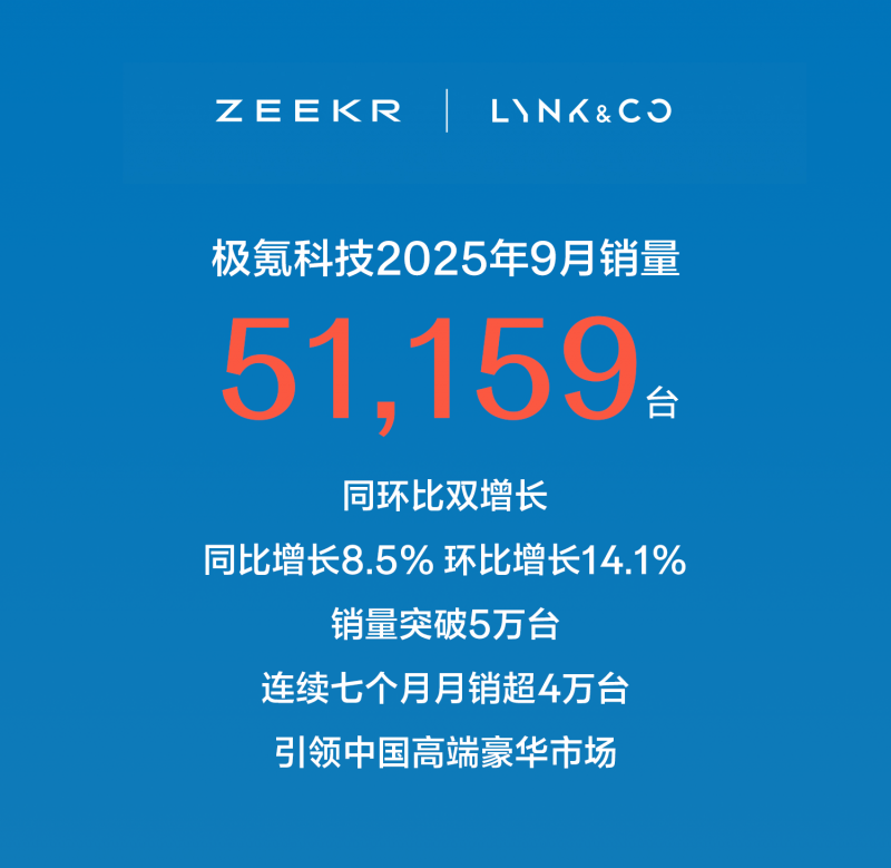 10月1日,极氪科技公布9月销量51,159台,同比增长8.5%,环比增长14.1%,同环比双增长,连续7个月月销超4万台。其中,极氪品牌9月销量18,257台,领克品牌9月销量32,902台。全球超豪华SUV新旗舰极氪9X限时售价45.59万元起,上市13分钟大定突破10,000台。领克10 EM-P上市,重新定义高端电混价值。领克900上市4个月交付超3万台,连续5个月销量跻身高端全尺寸混动SUV前三。领克900、领克10 EM-P作为官方指定用车,以实力护航2025领克杭州网球公开赛。9月9日吉利星座第五轨卫星以一箭11星方式发射,领克900卫星成功入轨,将持续参与天地一体化生态建设,为全球用户创造更安全、更便捷、更愉悦的出行体验。全球化方面,极氪7X在阿联酋上市,领克官宣进入捷克、奥地利、瑞士,目前已进入欧洲25个市场。领克品牌举办海外首届Co客大会并正式推出海外用户IP“LYNKUS”。截至目前,极氪科技已进入60多个国际主流市场,全球门店超1300家,全球用户超210万。