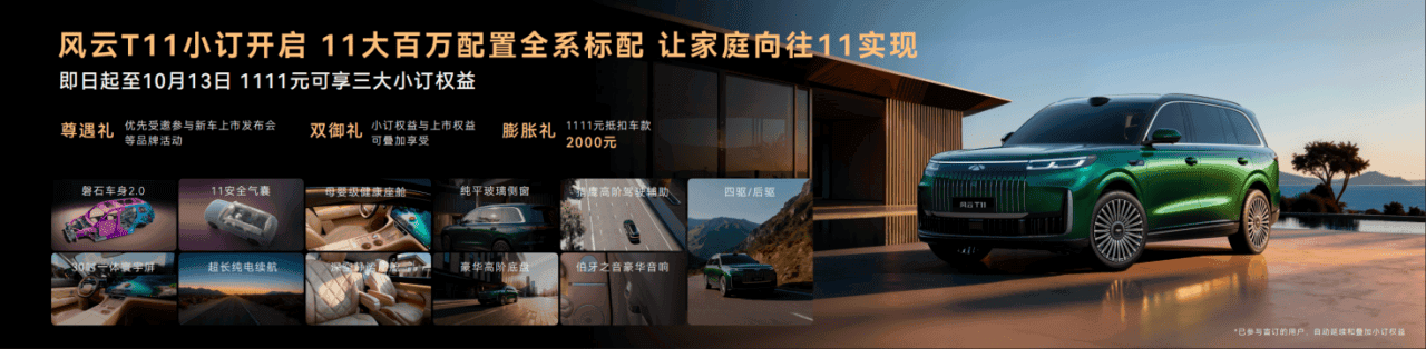 即日起至10月13日,用户只需支付1111元下订,即可尊享三大小订权益:优先受邀参与新车上市发布会的“尊遇礼”、小订与上市权益可叠加的“双御礼”、1111元抵扣2000元车款的“膨胀礼”;已参与盲订的用户,还能自动延续并叠加小订权益。更值得期待的是,风云T11将搭载11大百万级配置全系标配,从智能到安全,从舒适到性能,全面刷新六座SUV的价值标杆。