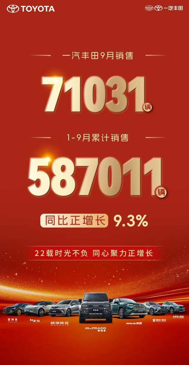 2025年10月1日,一汽丰田率先公布9月销售业绩;9月销售新车71031辆; 1-9月累计销售新车587011辆,同比增长9.3%,正增长定式持续延续。
