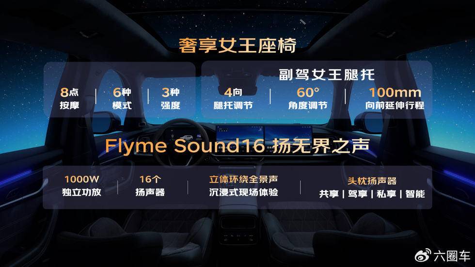 越享舒适上,星越L全新东方曜不仅主驾配备座椅按摩功能,还配备了焕新升级的“奢享女王副驾”,拥有8点座椅按摩,6种模式,3种强度,以及新增4项腿托功能,只需轻触调节,腿托即可向前延伸达100毫米,并支持高达60度的多角度自由调节。轻松实现零重力坐姿。后排靠背支持30°-40°电动无级调节,一键到位,每位乘客皆可从容安坐。而在听觉上,全新东方曜系列搭载由大师级团队专业调校的Flyme Sound 16扬无界之声,12通道精准布局,含同级唯一主驾头枕私密声场,真正实现“移动音乐厅”般的沉浸体验。而豪华麂皮内饰、琉璃溢彩256色氛围灯、高级车载香氛、50W无线快充等细节功能的加入,则让全新东方曜系列更具人性光辉。此外,星越L全新东方曜系列通过AI数字底盘与CCD可变阻尼悬架深度融合,实现了毫秒级动态响应,让底盘学会“思考”,提前预判、主动适应,于颠簸中提炼从容,赋予全家出行的松弛感。