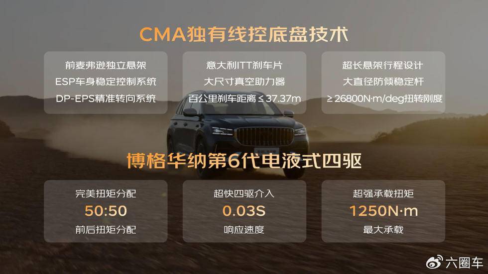 驾控性能上,全新东方曜系列搭载2.0TD高功率大涡轮发动机+爱信8AT黄金动力总成,最大功率200kW,峰值扭矩400N·m,零百加速仅6.5秒,性能提升14%,让高性能,不再只是豪华品牌的专属;基于CMA线控底盘打造,并配备四轮独立悬架、运动负外倾角设计及大直径防倾稳定杆等,使得全新东方曜系列在极致运动与舒适驾乘之间找到完美平衡。更值得一提的是,星越L全新东方曜还将搭载博格华纳第六代电液式四驱系统,0.03秒极速响应,实现50:50扭矩分配,无惧湿滑雨雪,亦可纵情旷野。