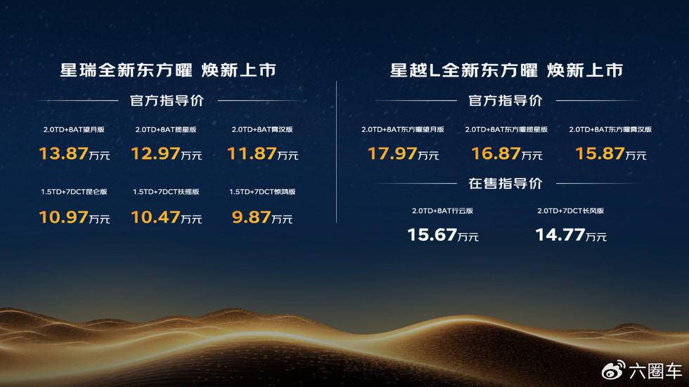 中国星全新东方曜以“中国设计、智能科技、极致驾控、越享舒适、中国式安全”重新定义中国燃油车的价值标准,官方指导价9.87万至17.97万元。其中,星瑞全新东方曜焕新2.0TD+8AT与1.5TD+7DCT两种动力组合共六个版本,官方指导价9.87万至13.87万元;星越L全新东方曜则焕新三款2.0TD+8AT车型,官方指导价15.87万至17.97万元。