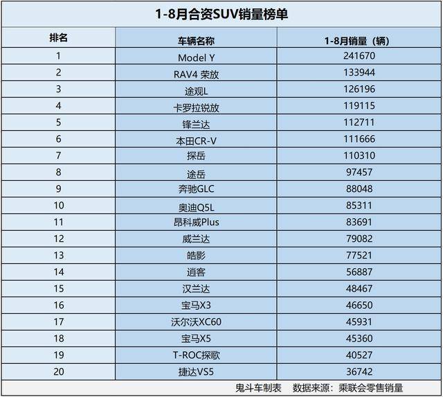 为了让想要买车的消费者看得更清楚,此次,鬼哥根据乘联会零售销量数据,整理出1-8月合资SUV销量排名前二十榜单,接下来,看看哪些合资SUV车型榜上有名?谁卖得更好?