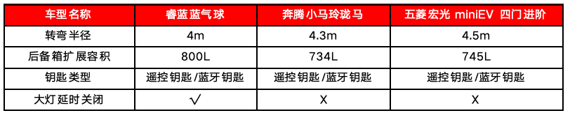 空间配置上,五菱宏光MINIEV后备箱容积可扩展至745L,奔腾小马则是734L,而睿蓝蓝气球后备箱容积可扩展至800L,在装载能力上具有一定优势,能够满足家庭出行的刚性需求。全车11处储物空间,精准解决家庭用户痛点,提供了更优的乘坐空间。同时,睿蓝蓝气球凭借3100mm的车长和2015mm的轴距,拥有同级最小的4米转弯半径,好开好停。