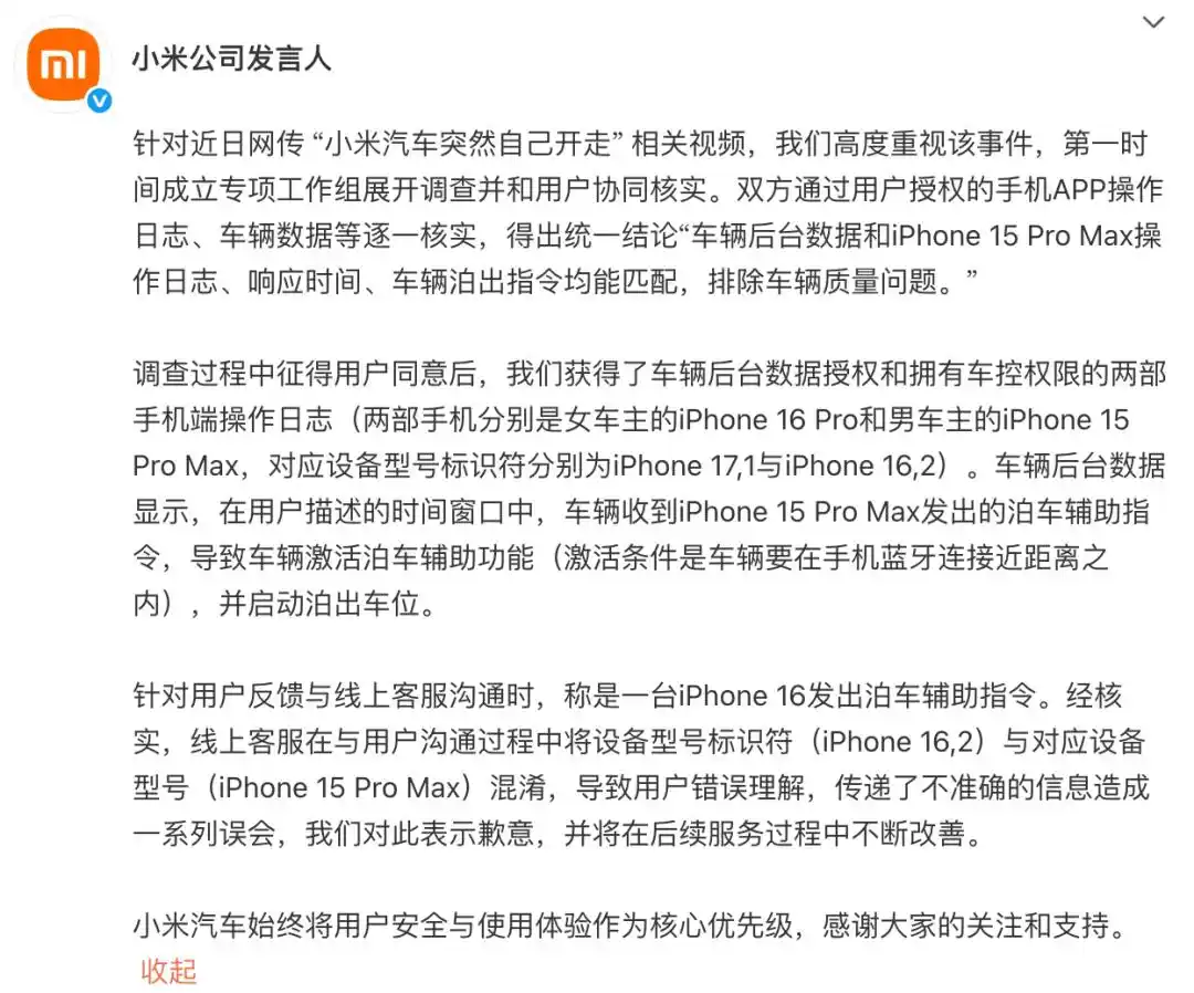 同时如果该车主依然不承认是其炒作的话,这个案例就将牵涉另一个知名品牌:iPhone,苹果。小米公司发言人发布的情况说明中强调操作指令是来自iPhone 15 Pro Max手机,假设该手机用户同时作为小米汽车用户还是没有人工操作并发出指令的话,那么问题到底出在哪里呢?