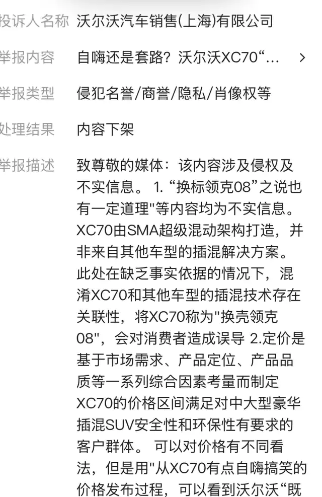 作为一款重量级车型,沃尔沃汽车XC70自上市以来获得了广泛关注。第一车道新媒体矩阵日前发文《新车|自嗨还是套路?沃尔沃XC70“限时参考尊享价”不如来个“一口价”》对XC70进行了报道,令人意外的是,这篇文章竟然被沃尔沃以“侵犯名誉/商誉权”为由投诉下架。