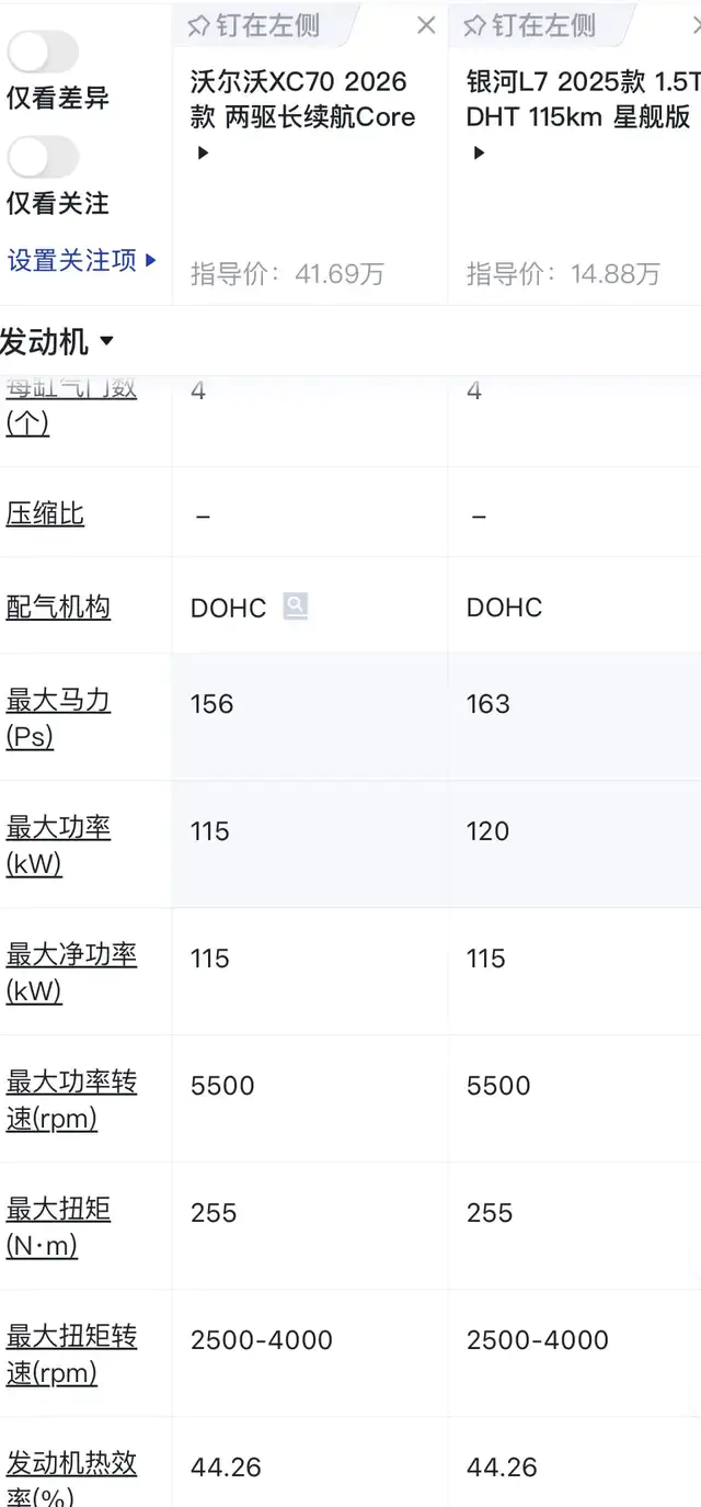 在查阅相关数据过程中,第一车道发现XC70搭载的插混发动机与吉利旗下多款车型的发动机一样,包括领克08EM-P、吉利银河L7以及银河星耀8等车型。我们不妨以吉利银河L7为例与沃尔沃XC70对比一下:二者型号都是BHE15-BFZ,都是1.5T,最大净功率都是115KW,最大扭矩都是255牛米,发动机热效率都是44.26%,排放标准也都是国六B。不过二者也有些许区别:吉利银河L7的最大功率是120KW,而沃尔沃XC70的最大功率是115KW;吉利银河L7加92号汽油,而沃尔沃XC70加95号汽油。