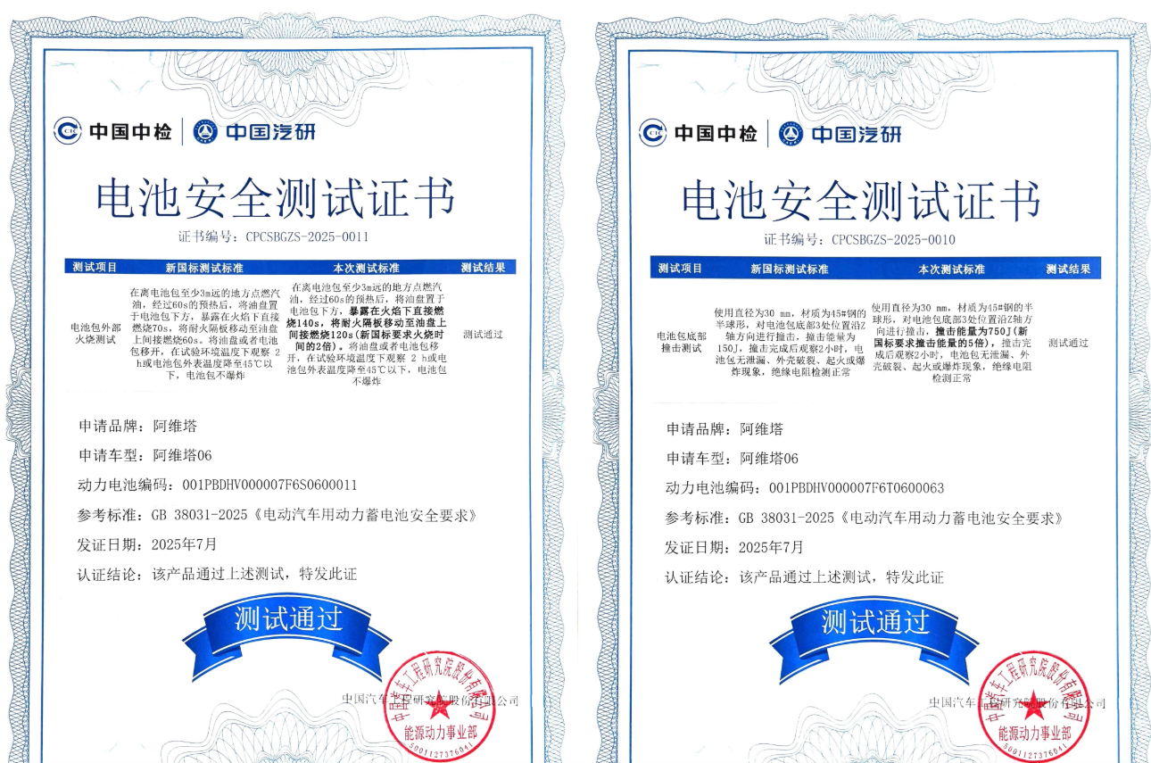 阿维塔06的电池在安全性上达到了新国标要求的5倍。阿维塔06联合中国汽车工程研究院进行了火烧、针刺与底部撞击三项严苛测试,成就三项“行业首个”认证。