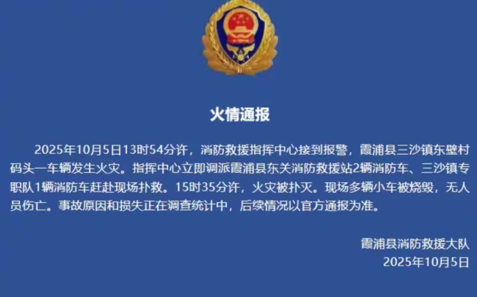 霞浦县消防救援大队发布的火情通报消息显示,事故原因和损失正在调查统计之中,后续情况以官方通报为准。