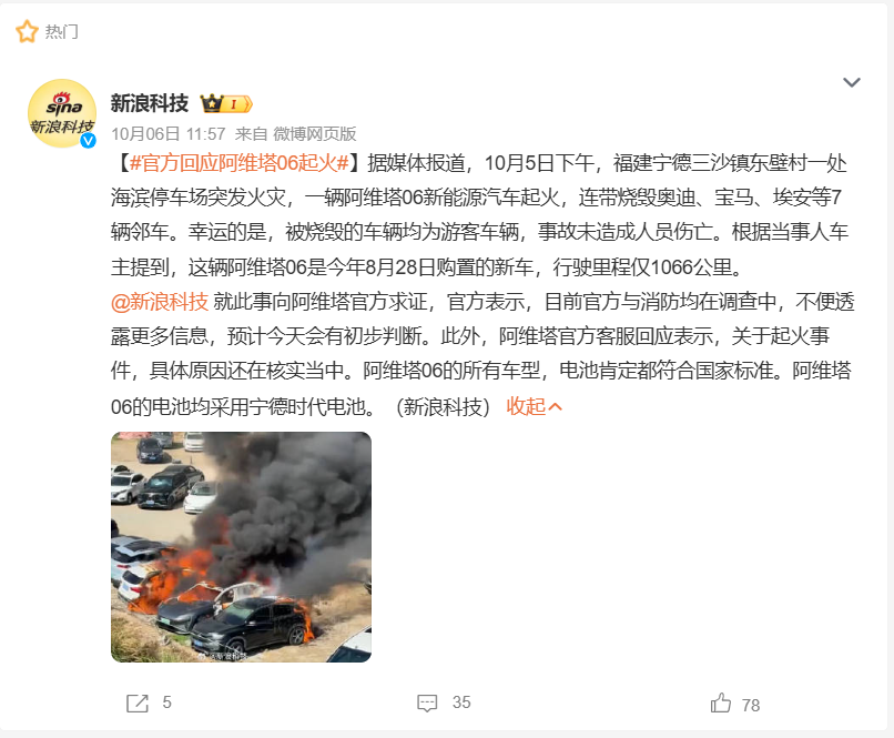 媒体消息显示,10月5日,在福建宁德三沙镇东壁村一处海滨停车场,一辆阿维塔06新能源汽车在静止状态下突然起火。火势借风迅速蔓延,最终导致多辆车受损,其中包括奥迪、宝马、马自达、埃安等品牌。
