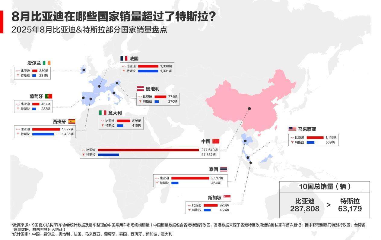 今年1-9月,比亚迪海外销量突破70万辆。据易车数据显示,2025年8月,比亚迪在西班牙、法国、意大利、爱尔兰、葡萄牙、奥地利等欧洲国家,以及新加坡、泰国、马来西亚等东南亚国家,销量均超过了特斯拉。