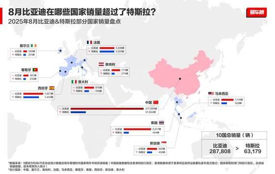 8月比亚迪品牌在全球多国销量超过特斯拉