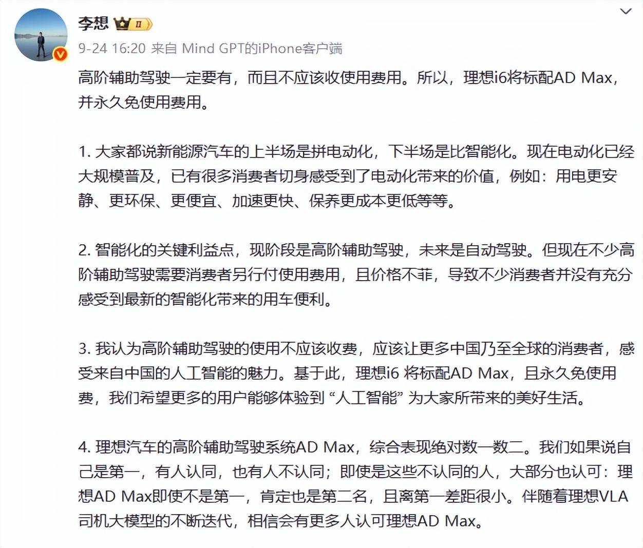 比如,押宝AI、力图让理想不止是一家汽车公司的李想认为:高阶辅助驾驶另行收费,导致不少车主并没有充分感受到最新的智能化带来的用车便利。