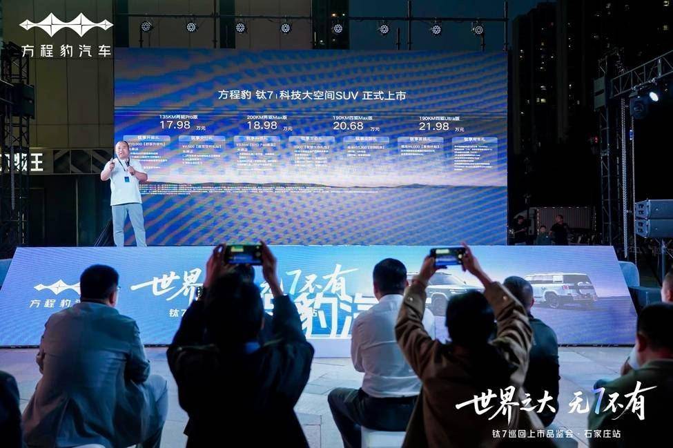 9月27日,世界之大 无7不有 钛7巡回上市品鉴会在石家庄裕华万达圆满落幕,石家庄市众多媒体与新车用户齐聚现场,共同见证“科技大空间SUV”钛7的正式亮相。 作为方程豹品牌打破 “二元对立” 的又一力作,钛 7 以大空间、高配置、强智能的核心优势,重新定义了家用硬派 SUV 标准。新车共推出4个配置版本,售价17.98万元-21.98万元:其中,135KM两驱Pro版17.98万元,200KM两驱Max版18.98万元,190KM四驱Max版20.68万元,190KM四驱Ultra版21.98万元,款款越级,款款超值,下单即刻享受最高价值超3.6万元的上市权益。