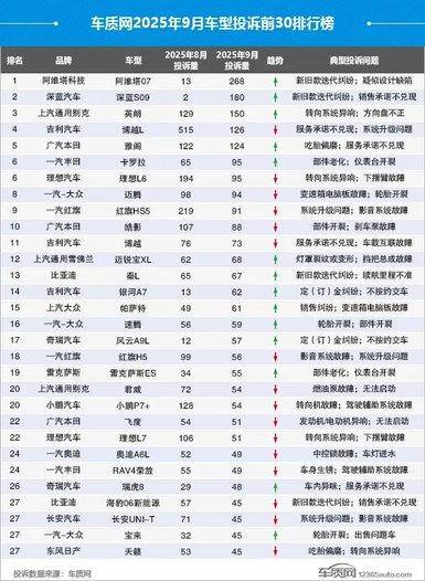 10 月 10 日,国内 9 月车型投诉排行榜正式发布。与 8 月榜单相比,本月排名格局发生显著变化,不仅有多款新车型闯入前列,核心投诉问题也呈现出鲜明的品牌集中性特征。