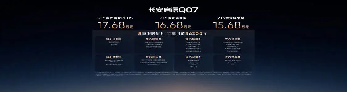 10月10日,长安启源Q07天枢智能激光版正式上新,共推出3款产品,分别为215激光尊荣型、 215激光旗舰型和215激光旗舰PLUS,上新价为15.68万元- 17.68万元。