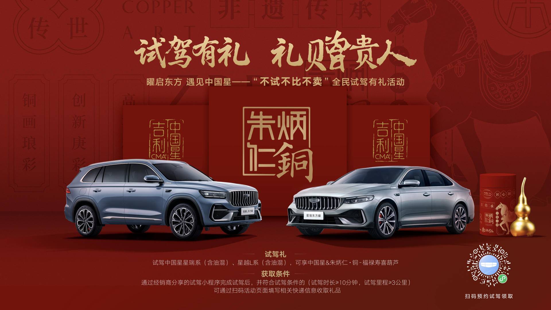 即日起至12月31日,针对购买中国星星瑞全系、星越L全系用户,每月将在第三方检测机构的监督与公证下,抽取300名幸运用户免费赠送中国星东方曜限量定制款MEIZU 22手机。此外,吉利中国星还携手中国非遗铜雕文创品牌——朱炳仁·铜,发起“试驾有礼,礼赠贵人” 不试不比不卖全民试驾有礼活动,到店试驾中国星星瑞、星越L系列车型,即可获赠由“朱炳仁·铜”匠心打造的【福禄寿喜葫芦挂件】一份。