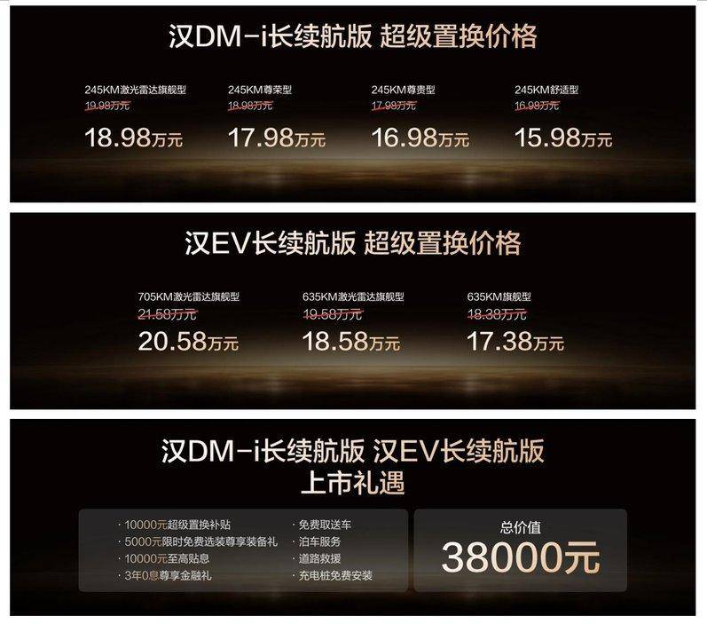 【车媒体丨新车】在中高端轿车市场,比亚迪汉是在消费者心中预期值较高的代表车型。10月11日,比亚迪汉长续航版加推上市,汉DM-i长续航版共推出4款车型,补贴后售价15.98万~18.98万元;汉EV长续航版共推出3款车型,补贴后售价17.38万~20.58万元(10月31日前完成购车可享1万元超级置换补贴)。同时,比亚迪还为用户准备了包含置换补贴在内的至高价值3.8万元七大礼遇。这种破局价格,无疑击穿市场心理防线。