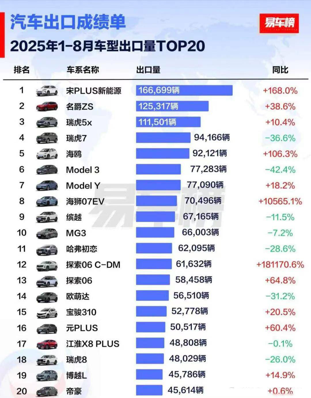 当然了,虽然宋PLUS在海洋网“退役”是大势所趋、早晚有那么一天,毕竟人家海洋网也要完成产品品类、名称的整体化,宋PLUS继续存在显得不伦不类。但是在其他市场,宋PLUS可依然是销冠级别的存在,今年1—8月份,国内汽车出口到海外的车型中,单一车型销量最高的一款车型,就是宋PLUS,销量达到了16.6万辆,成为比亚迪品牌出海的销量担当,这种表现,还是相当震撼的。