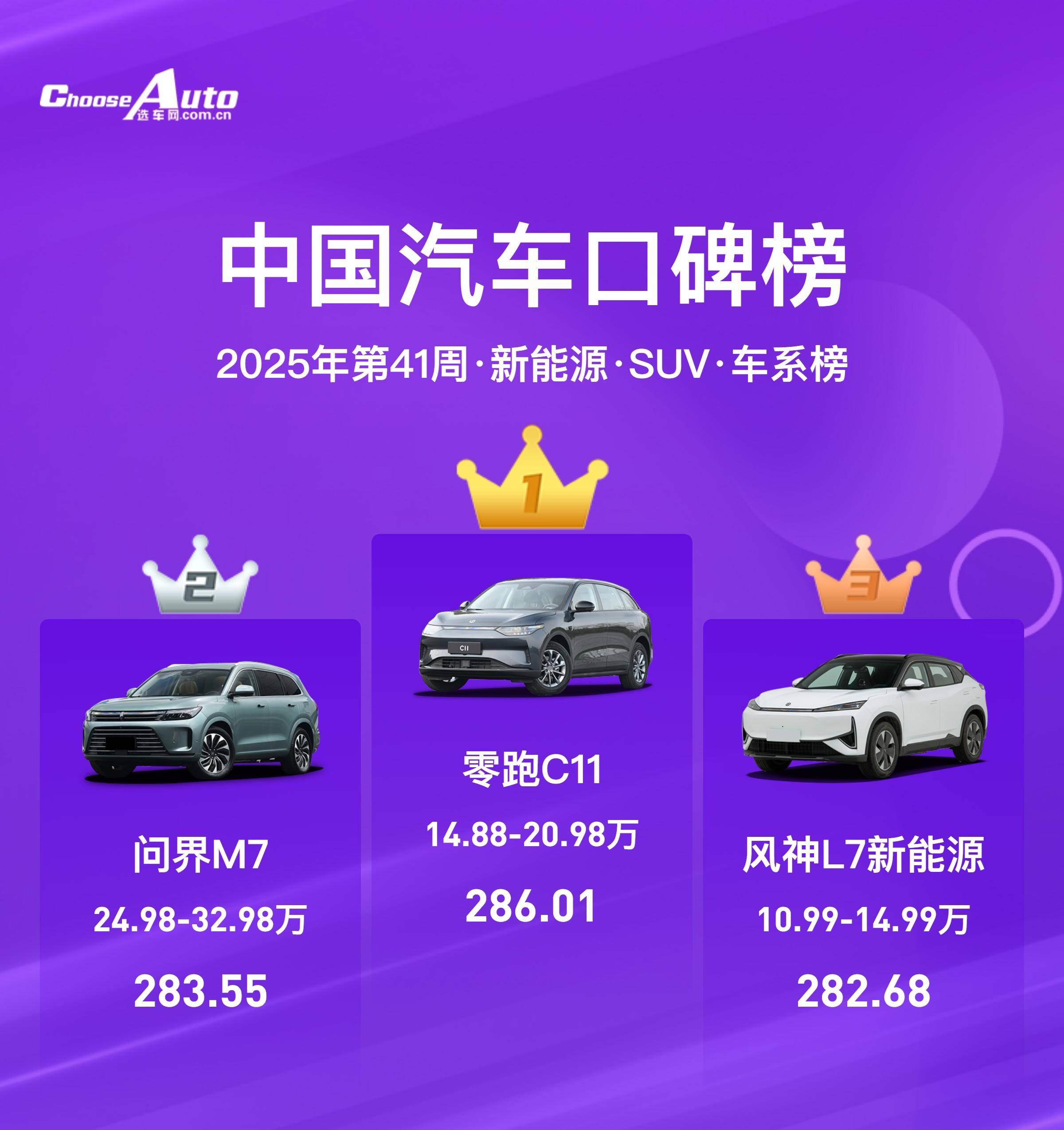 新能源SUV榜单中,零跑C11以14.88-20.98万元的价格覆盖主流市场,持续吸引家庭用户关注。问界M7则以24.98-32.98万元的定位主打中高端市场,口碑分值达到286.01,显示出一定的用户满意度。
