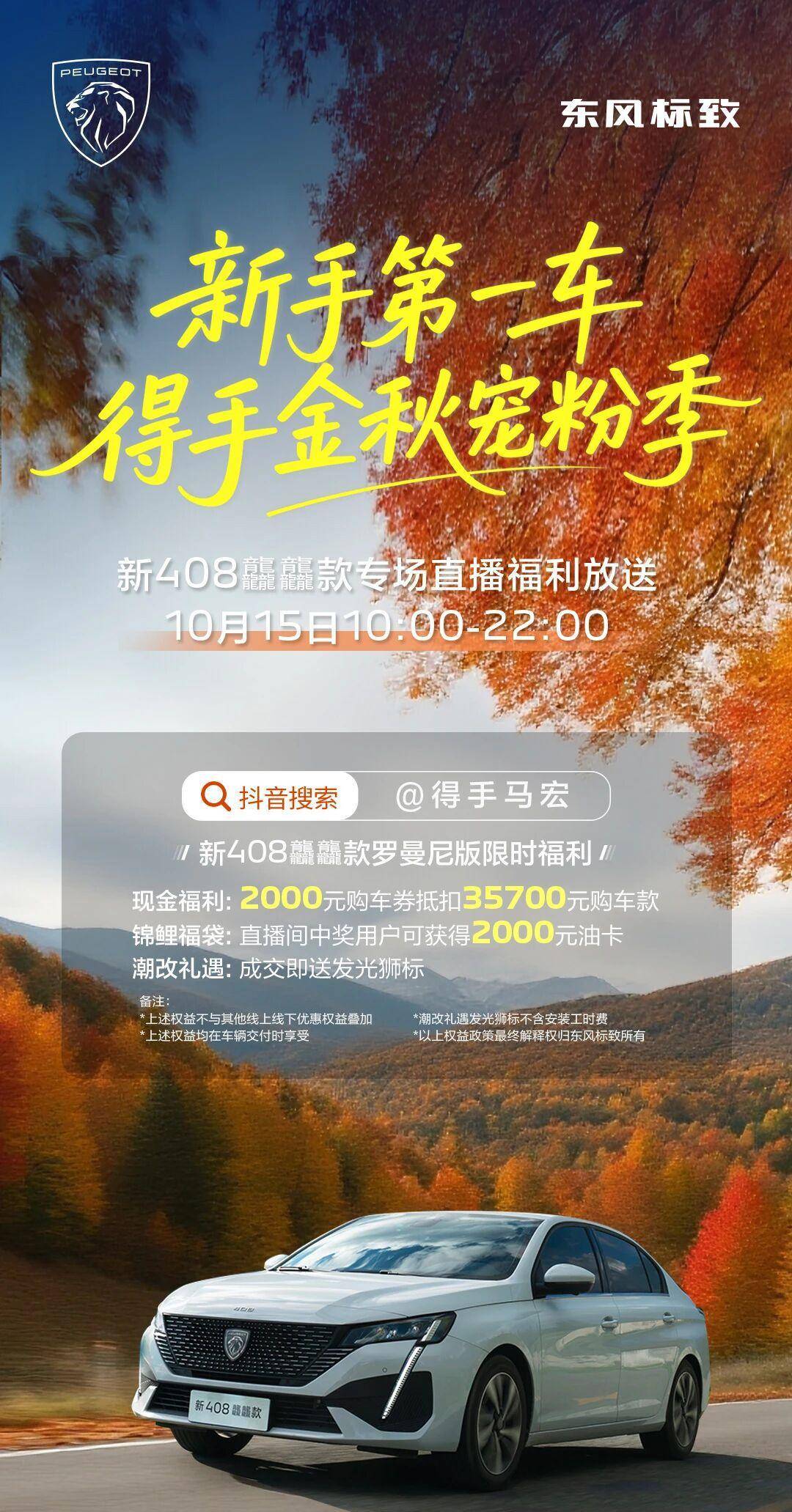 兄弟们,如果你想在10月份去入手一台法系车,那么我建议你,不妨去蹲点一下东风标致的直播间。为什么这么说呢?因为在10月15日的10:00-22:00,东风标致新408龘龘款将有专场直播福利放送,至于具体的福利有多大,您不妨接着往下看看。
